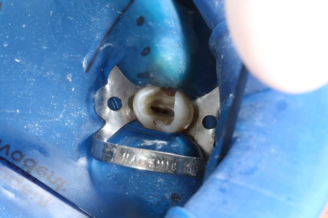 Quand ça arrive (prob d'axe souvent), la dynamique du mac spadden rend assez facile le retrait du morceau fracturé souvent, juste aux précelles, avec de la gutta fondue autour.