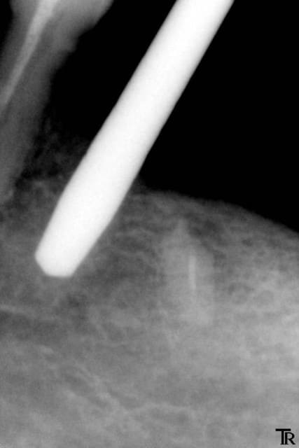 Je mets l’implant en place, et voilà ce que j’obtiens après la radio : l’implant qui aurait pu être mis plus profondément.