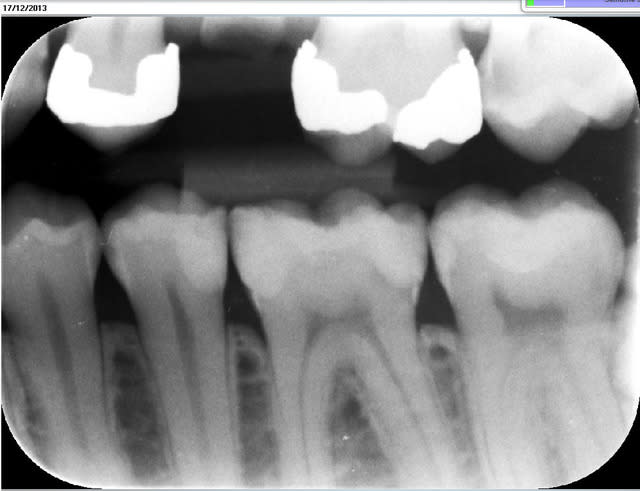 Faut avouer qu'ici l'indication du composite sur la 6 est quand même un peu "couillu", en distal par contre il reste une radio clarté: carie résiduelle ou épaisseur de colle importante, en tous cas ça peut fragiliser la suprastucture.