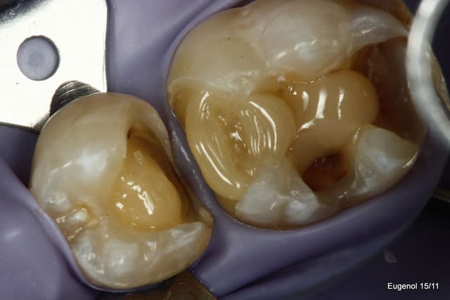 Beau boulot, il ne reste plus qu'à ajuster l'occlusion car c'est difficile avec la digue. Tu meules les cuspides antagonistes pour ne pas massacrer un si joli travail ?