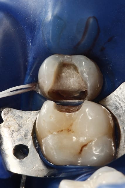 De plus sur ce cas, sur la 7 j'ai une cavité proximale sous le point de contact. L'abord est que mésial, et juxta gingival, et j'ai un accès total par la cavité de la 6...comment fais tu ? tu mets une matrice et tu ouvres la crête marginale ?