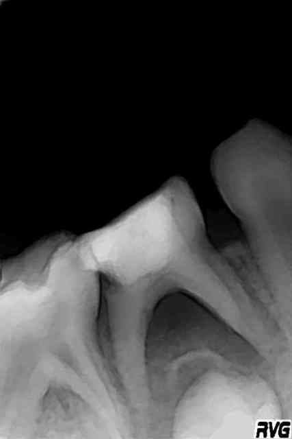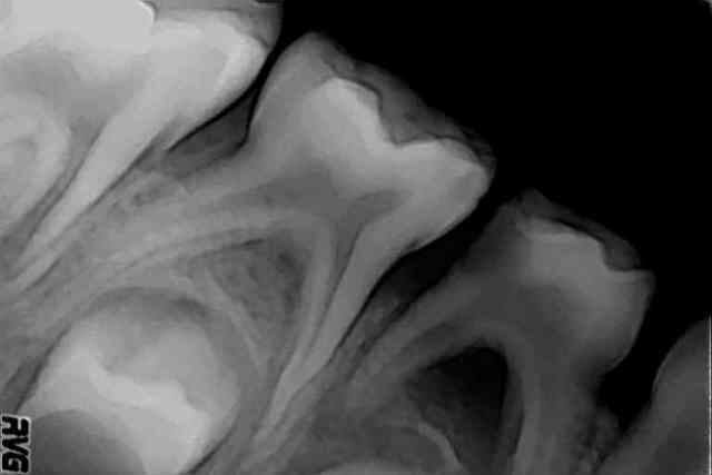 > une dent tempporaire en stade 2 (racines non resorbées) avec un abcès.. vous