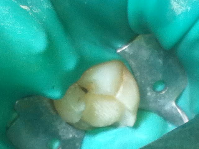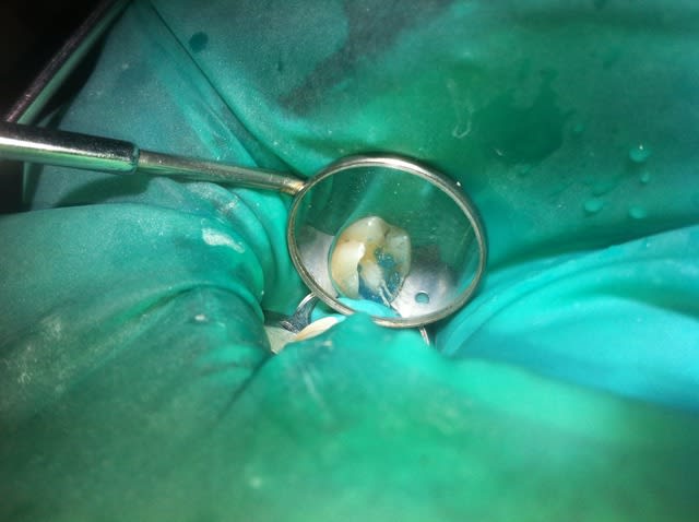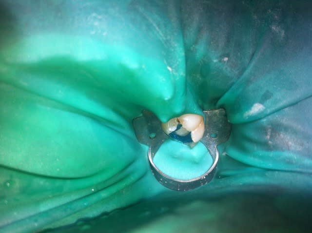 Aujourd'hui : retouche du CVI puis (première photo au stade du mordançage) compo pour le core build-up, pansement.