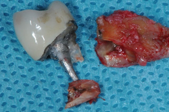 Si un patient a une dent douloureuse avec des "petites boulles blanches" et une mobilité, il faut démonter la couronne, refaire l'endo si aucune fracture n'est visible, puis refaire une couronne; ou extraire la dent si une fracture est visible une fois la couronne giclée.