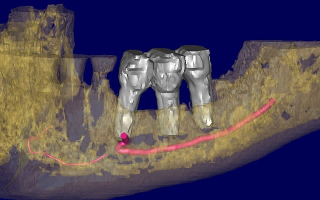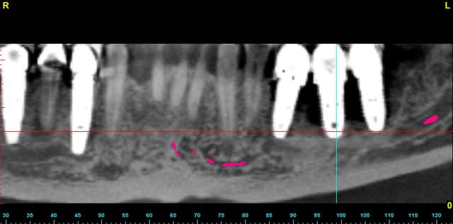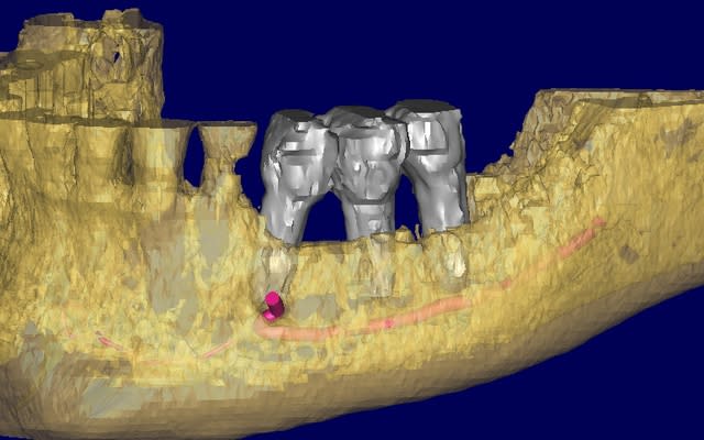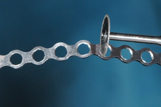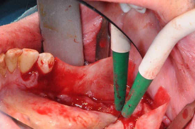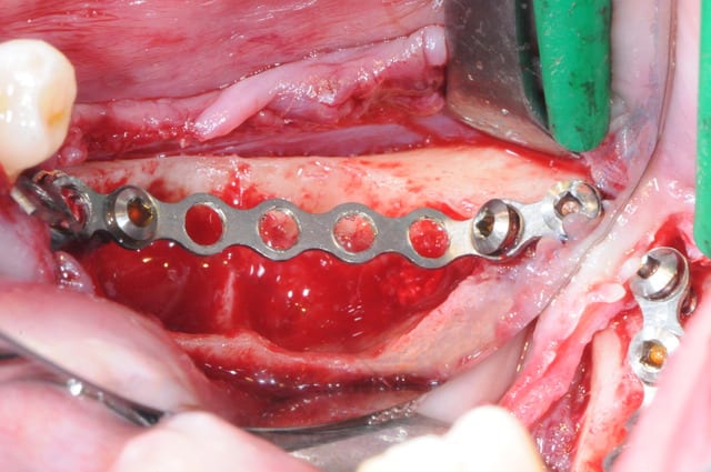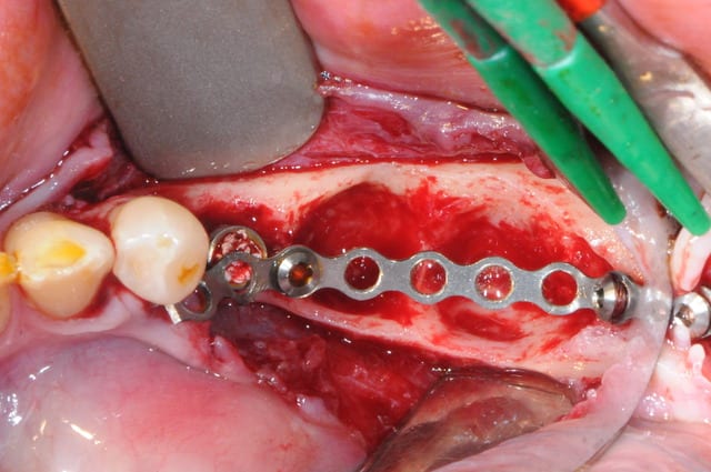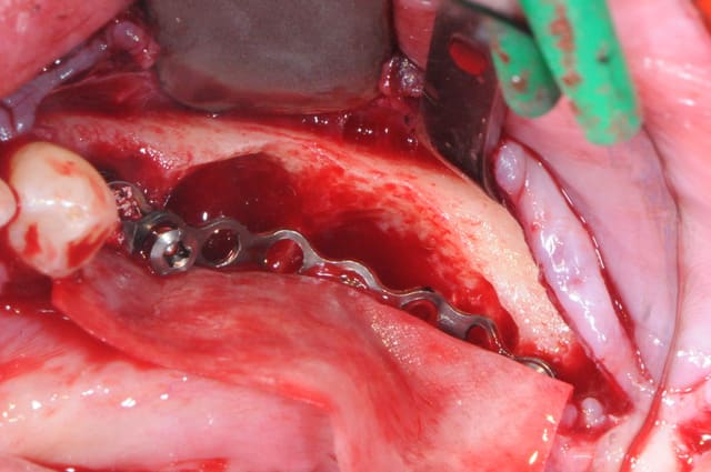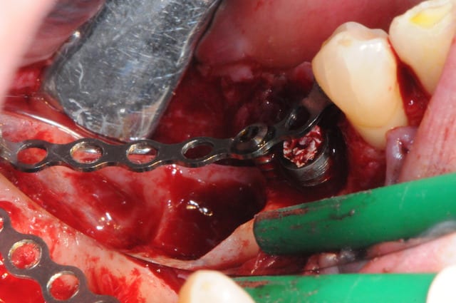 4-5-6-7 sciage de la mesh titane et positionnement in situ d'un bout à l'autre de l'arcade.