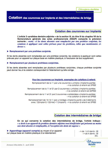 L'avenant 3 prévoit que dorénavant les couronnes sur implants seront prises en charge sur la base de 107.50, comme les couronnes sur dent naturelles.