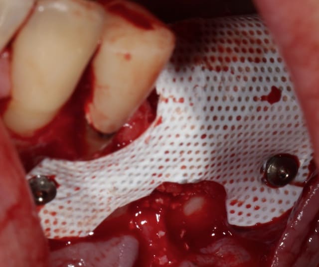 Puisqu'on parlait de ROG verticale, en voici une toute fraiche de ce matin, comblement osseux 50/50 os autogène et Bio-oss le toute recouvert par une membrane PTFE armé titane pinsé.