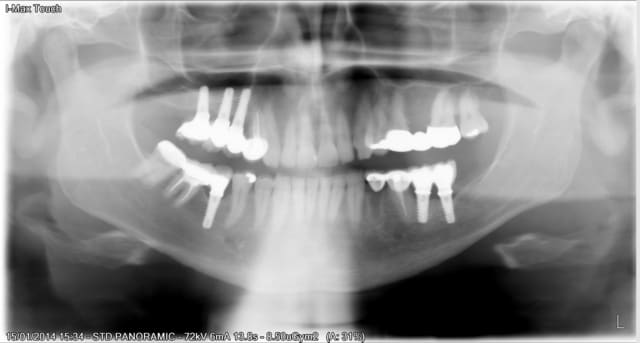 Son ancien prat lui a proposé de jumeler les implants avec la 35 et la 33 a tailler.Le patient judicieusement trouve le plan de traitement fumeux et vient pour un 2eme avis.