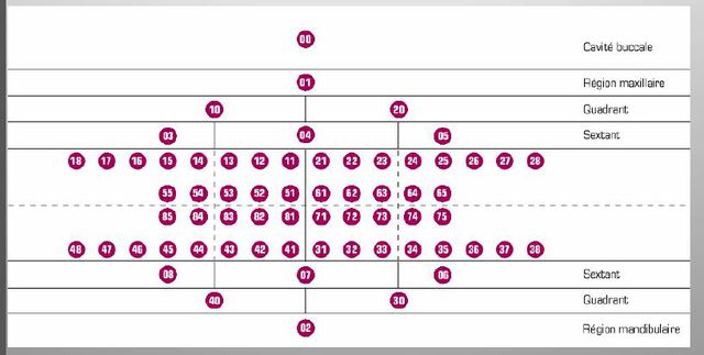 il faut jongler avec les zones: quadrant, sextant ou maxillaire, mandibule , qui correspondent à plusieurs dents à la fois