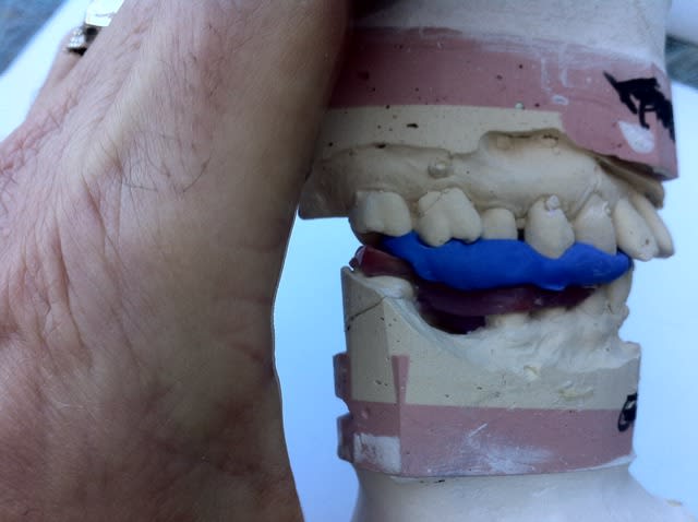DV effondrée, particulièrement évident en antérieur : réalisation d'une gouttière occlusale mandibulaire rétablissant une DV validée par le mieux-être ressenti par le patient.