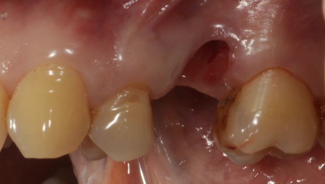 J'ai décidé de réaliser un lambeau déplacé latéralement associé à un conjonctif enfoui le jour de l'extraction afin d'avoir des tissus mous de meilleure qualité pour la greffe, ci joint les photos à 6 semaines.