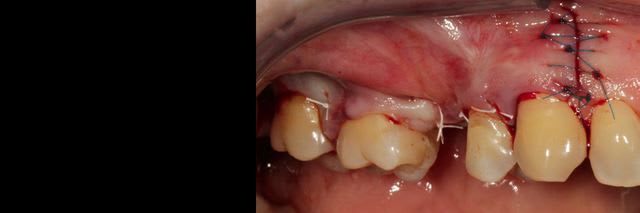 J'ai décidé de réaliser un lambeau déplacé latéralement associé à un conjonctif enfoui le jour de l'extraction afin d'avoir des tissus mous de meilleure qualité pour la greffe, ci joint les photos à 6 semaines.