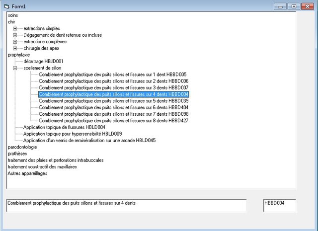 >ree tout simplement des combo box deroulantes une par famille (soins chirurgie prothese etc) qui donne acces à une autre combo box par categorie (ex extraction une dent , 2 dents, 3 dents etc) qui donnera accesà la derniere combo avec les codes ccam correspondants à ton soin.<