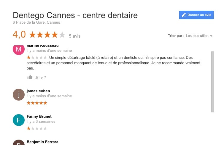 Apparemment google ne sait pas faire une moyenne, 3 fois une etoile, 3 fois 5 etoiles, moyenne des 6 c'est 4 etoiles selon eux.