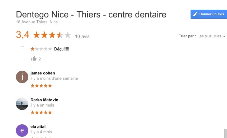 Apparemment google ne sait pas faire une moyenne, 3 fois une etoile, 3 fois 5 etoiles, moyenne des 6 c'est 4 etoiles selon eux.