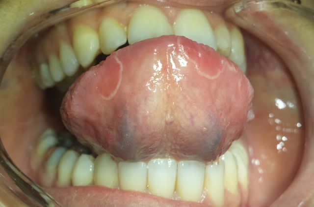 Patiente de 27 ans, pas de problème de santé, pas de médicament, pas de tabac, présente depuis hier une lésion au niveau de la langue. Ne se décolle pas au grattage, léger picotement ressenti.