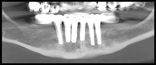 Patiente se présentant avec 6 implants posés depuis 4 ans en avant des 2 mentonniers, avec prothèse provisoire scellée suite à MCI.