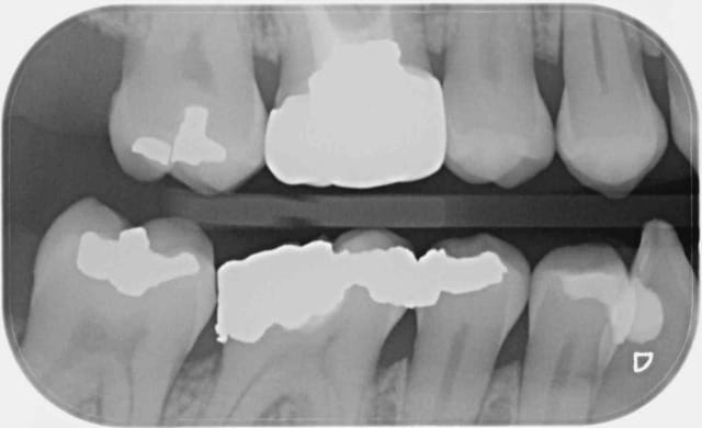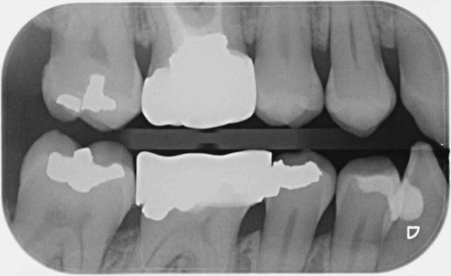 Rien que sur la radio, je vous laisse admirer la qualité de la morphologie occlusale, le profil d'émergence, les points de contact (ou leur absence)... Je n'ai pas osé prendre de photo de ce blockhaus.
