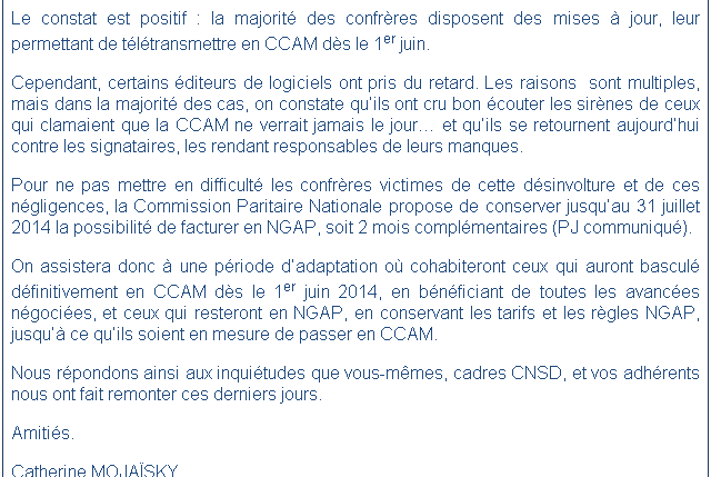 "Comme nous vous l'avions déjà annoncé et conformément aux engagements pris lors de la négociation conventionnelle, la Commission Paritaire Nationale des chirurgiens-dentistes vient de rendre ses conclusions sur l'état du déploiement des outils nécessaires au passage en CCAM. Le constat est très positif : la majorité des confrères disposent des mises à jour, leur permettant de télétransmettre en CCAM dès le 1er juin.