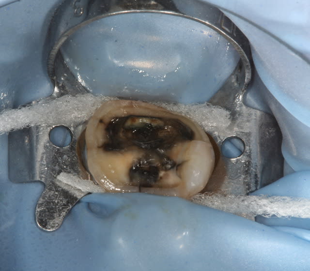Et pour en rajouter une petite couche, des fêlures, toutes les dents en ont. Sous un amalgame, peut-être un peu plus ou alors seulement parce que les produits de corrosion y ont diffusé et qu'on les voit mieux.