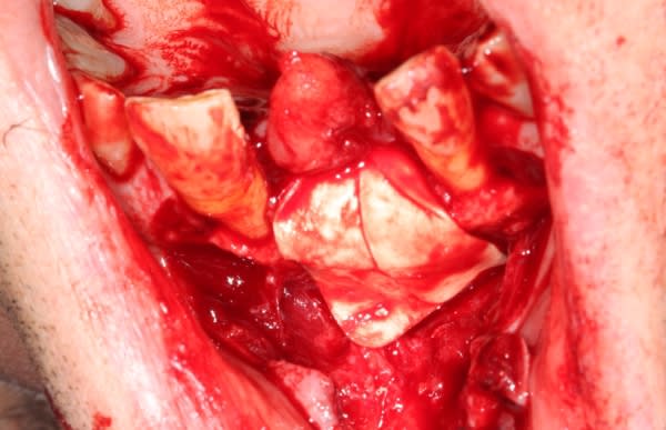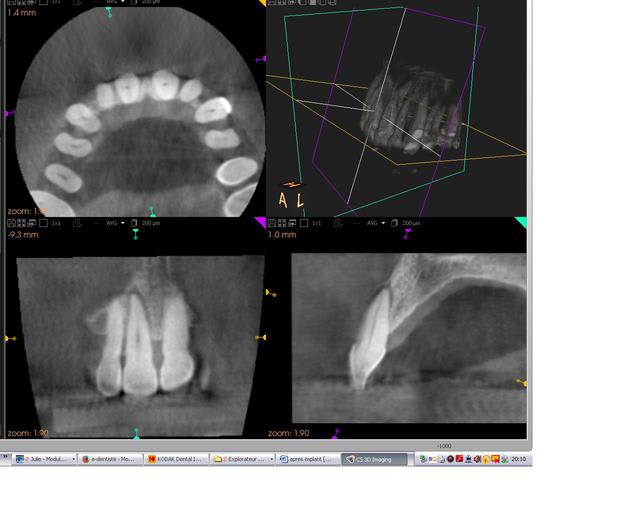 Un cas qui ressemble mais avec un implant qui n'est pas à l'intérieur du boitier osseux mais reconstitution de la paroi vestibulaire après pose d'un implant sur crête mince avec expansion, fissuration de la corticale vestibulaire.