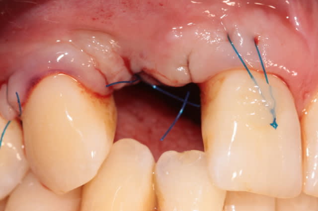 Effondrement tissulaire après extraction et lambeau repositionné coronairement pour essayer de retrouver une papille entre centrale et latérale. La dent de la patiente est recollée.