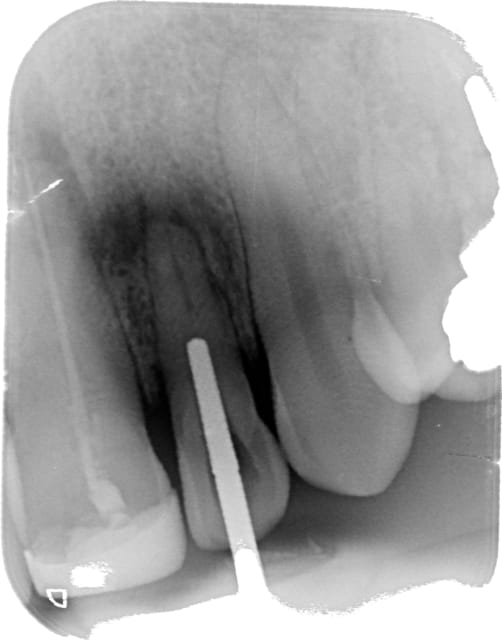 Maintenant la perforation complique les chances de conservation de la dent sur l'arcade au vue de sa petite taille (rapport couronne/racine)