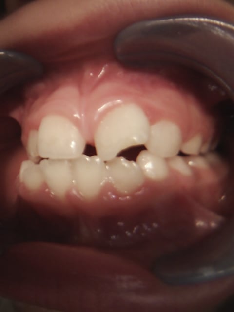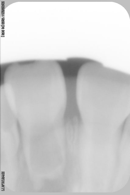 Si aujourd'hui la dent est en malposition c'est sans doute à cause de l'interposition de la lèvre inférieure. Le centre de résistance de la 21 étant positionné plus coronairement, la 21 offre moins de résistance à la version corono-vestibulaire que la 11, d'où l'asymétrie avec 11.