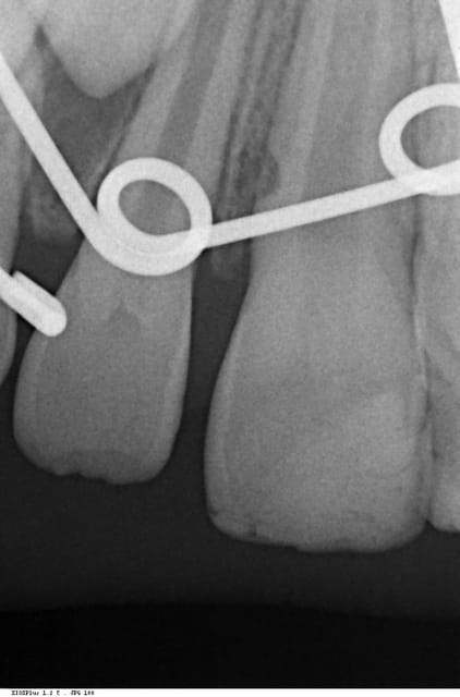 à la radio d'abord tout bon, puis un petit truc pas net sur 11 et 21 dans la partie cervicale de la racine. Aujourd'hui abcès en Mésio Vestibulaire de 11, et là, la radio ne laisse pas de doute sur la présence d'une résorption externe radiculaire cervicale. ATB pour l'abcès, mais la suite?