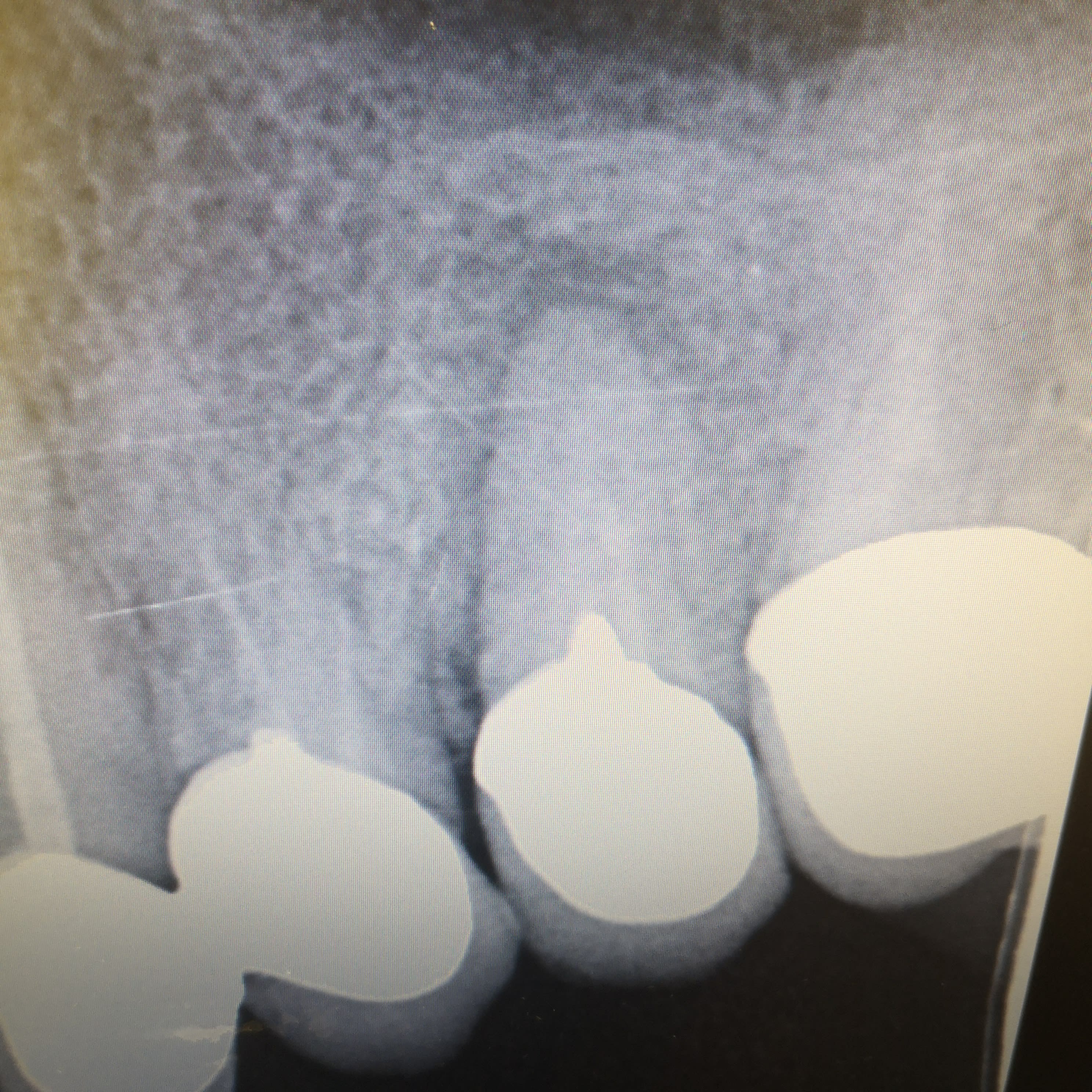 Extraction, curetage alvéole, laser sur l'apex et le periapex et remise en place en sous oc, calée au flow avec les voisines.