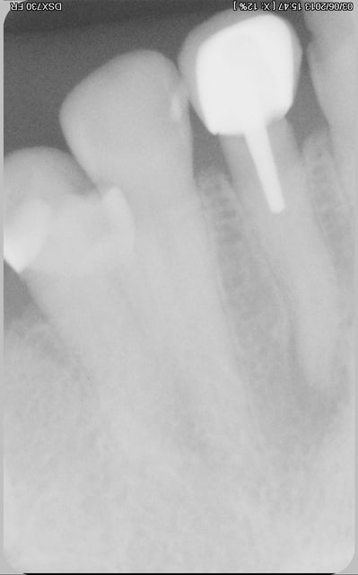 - secondo : je constate encore une fois une perte osseuse au niveau cervicale, qui aurait pu être évité en effectuant un traitement endodontique orthograde, avec des instrument adéquat et un appui pariétale en mésial.