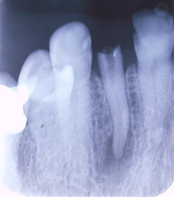 Lorsque ces dents finissent par se nécroser, et ne présentent plus aucune sensibilité, celles-ci demeurent asymptomatique dans 30 à 40% des cas (je ne suis pas sûre de ce taux, que j'avais lu dans la littérature odontologique il y a quelques mois), et ne présentent donc ni douleur, ni signe radiologique.