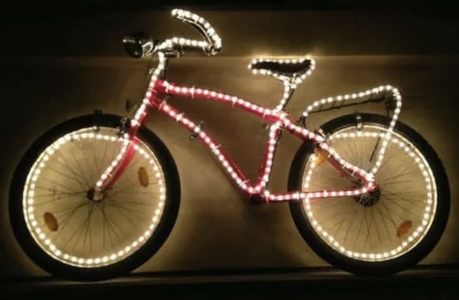 J’ai croisé ton vélo sur la route. Tu feras gaffe que le père Noël ne te prenne pas pour un sapin de Noël , étant donné que t’as mis beaucoup de guirlandes sur ton vélo
