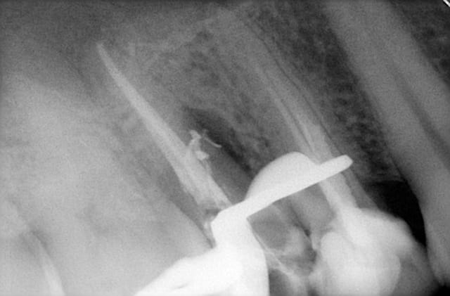 J'ai un patient qui est venu pour un "point blanc" sur la gencive dans le secteur 1. Pour moi c'est abcès qui a "fistulisé"; en prenant la radio je vois donc cette lésion dans le 1/3 moyen de la 15 et je décide de reprendre le traitement canalaire quelques jours plus tard.