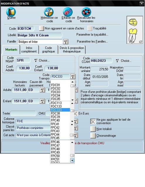 Il y a encore des cas (pannes d'ordi, carte vital invalide mais attestation du patient valide)où nous choisissons de transmettre à la Sécu nos mémoires CMU-C pour règlement. Dans ce cas lorsque nous faisons nos mémoires "papiers" nous sommes tenus de faire apparaître le code de transposition CMU-C correspondant à la prothèse adjointe ou conjointe réalisée (cf. liste distribuée par la Sécu en son temps).