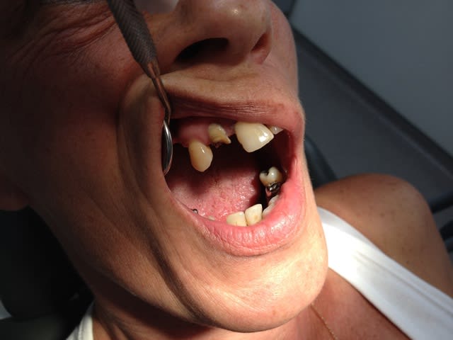 Il s'agit d'une patiente de 45 ans, célibataire, femme de ménage, très complexée par sa bouche mais coquette. Elle est phobique du dentiste avec anxiété et manque de confiance..