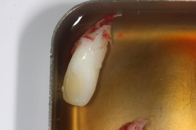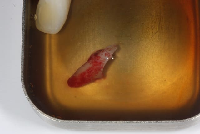 Bilan: 11 21 fracturées mais la 22 est semi expulsée, collée à la gencive. Je me dis que je vais faire une réimplantation mais je découvre, en la prélevant, qu'elle a été fracturée . Reste donc la moitié de la racine que j'arrive à extraire avec une curette en laissant l'os et la racine intacte. J'ai traité le canal et recollé les deux morceaux et réimplanté.