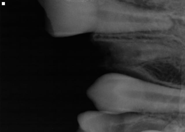 - Pour la 22 : impossible de prédire avec certitude la suite. Une résorption externe est très probable avec une perte de la dent dans un délai de 6 mois à 6 ans.