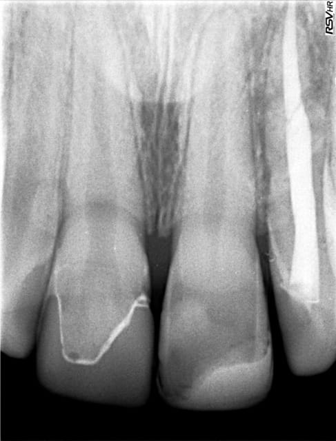 Ce qui est a noter sur la rétro du confrère, c'est la différence du volume pulpaire entre 11 et 21 :