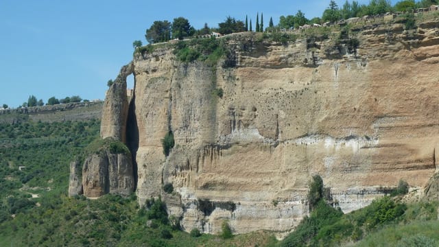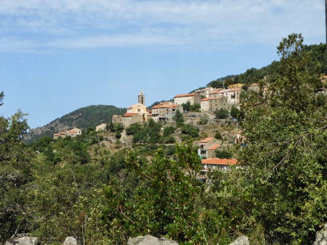 Pas un clocher, aucun édifice remarquable, toitures invisibles, de vagues bungalows parmi les cyprès en haut d'une jolie falaise en pouzzolane à enjambement... c'est mince, pour jouer...