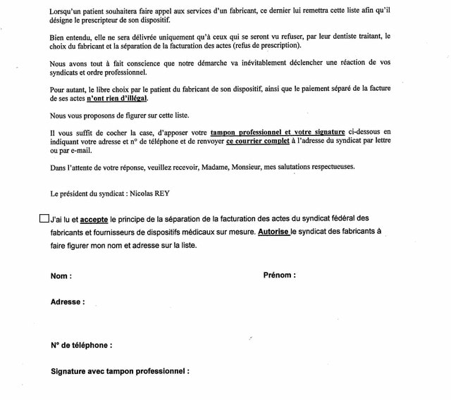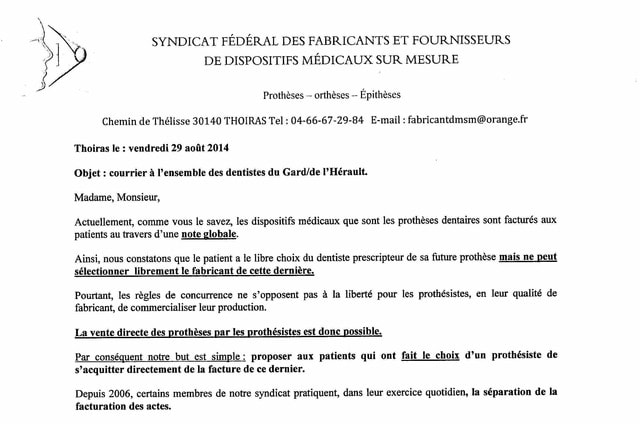 Je ne sais pas quelle importance a ce syndicat chez les prothésistes, mais il m'a tout l'air d'être l'émanation d'un seul et même gars. Il n'est donc peut être pas représentatif de sa profession. Reste à espérer que le CO fasse quelque chose.
