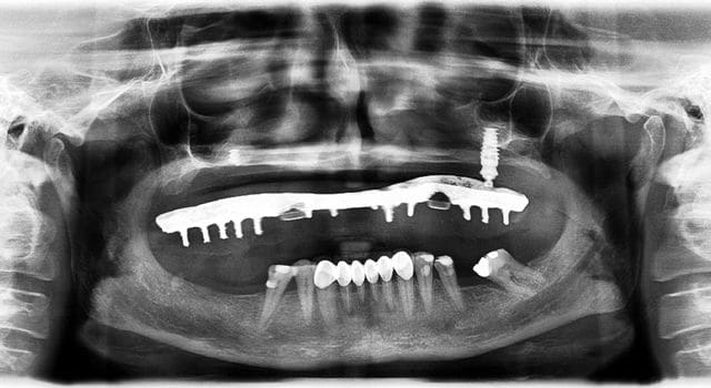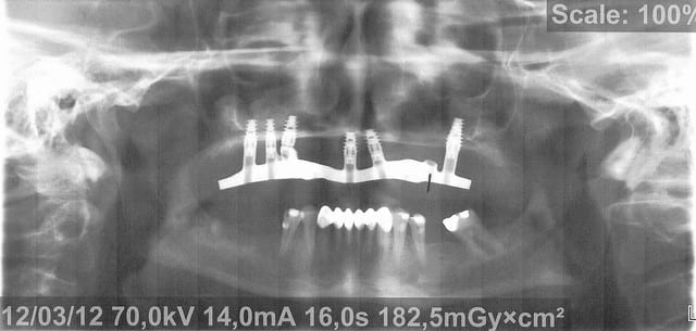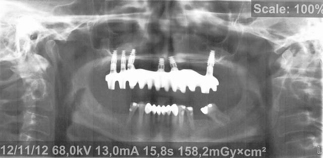 - On y voit une perte d'un implant sans changement de plan de traitement, on se retrouve avec un seul implant du coté où mastique le patient