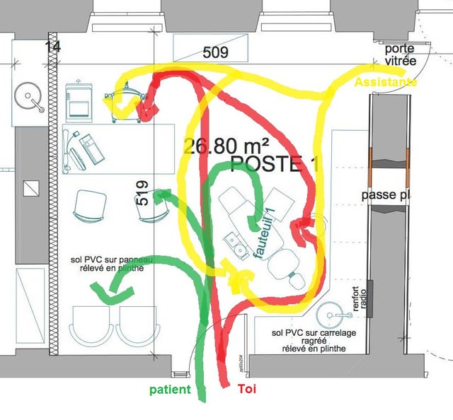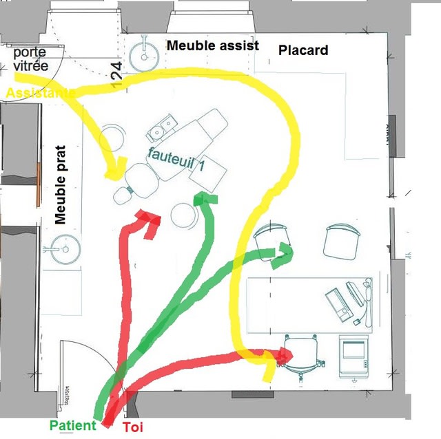 -la circulation des personnes: sur ton plan avec la porte au milieu du mur, les trois circulants(toi, ton assistante et ton patient) se croisent de partout et tout le temps si c'est un papy avec déambulateur tu vas comprendre (c'est le schéma circul1). Le fait d'inverser tes deux pièces a l'avantage d'une porte d'accès dans un coin: meilleure circulation (circul2).