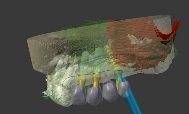 Entre nous, je ne vois pas l'utilité d'un guide pour anguler un implant en avant d'un sinus : une bonne analyse 3D, une prise de repère, et un sondage de la paroi antérieure font tout à fait l'affaire. Pour l'indexation, on ne sera pas à 1 pouillème d'enfouissement près pour contrôler ça.