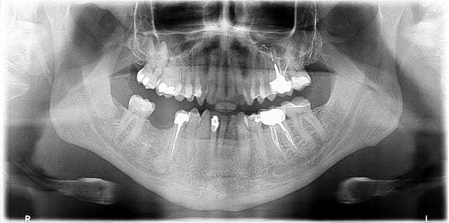 Si je peux me permettre fatboy ton patient n'a pas la langue au palais sur ton cliché, erreur très répandue qui est responsable du large dôme sombre qui s'étale entre le dos de la langue et le palais osseux. Demande au patient de 'sucer' la tige sur laquelle il mord (je te laisse libre de trouver la formule verbale qui convient et ne le fera ni rougir ni éclater de rire...), cela permet en général de lui faire plaquer la langue au palais correctement et la lecture de la région apicale est nettement améliorée.