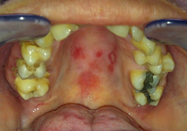 Pour revenir a la lésion palatine et pour ne pas uniquement poluer le fil de discussion, j'ai justement vu la même cette semaine (le reste était nickel par contre). Est-ce que ça peut être l'évolution d'une lésion érosive? (Je ne développe pas). Des avis?