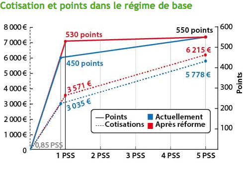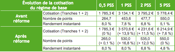 Le Conseil d’administration de la CNAVPL a donc proposé une réforme entérinée par un décret le 27 novembre 2014 : le plafond de la première tranche passera de 0,85 PSS* à 1 PSS, celui de la seconde tranche reste à 5 PSS mais le taux de cotisation s’applique dès le premier euro et non plus à partir de 0,85 PSS comme auparavant. Pour que cette augmentation soit neutre pour les bas revenus, les taux ont été modifiés : la première tranche passe de 10,10 % à 8,23 %, la seconde reste à 1,87 %.