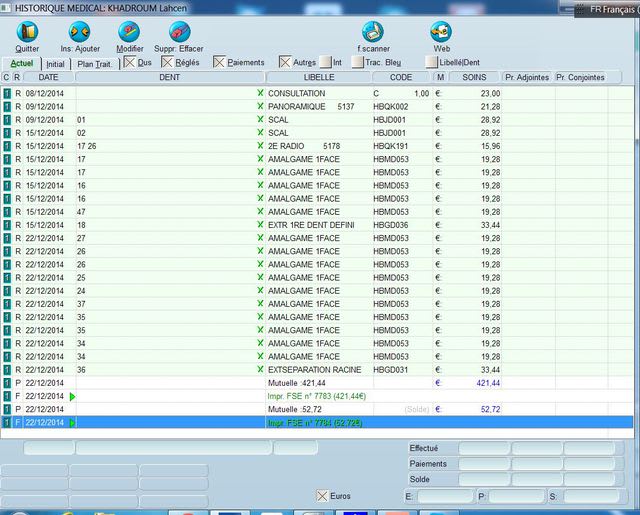 Par contre, je ne m'explique pas comment sur ta FSE tu as noté NR pour tout tes soins et que dans l'historique de Julie tu aies un 1/3payant du total. Je crois comprendre que ton patient est CMU, alors je ne vois pas pourquoi NR pour des cavités bien dans les clous des directives CNSD et CPAM. Maintenent ce qui interpelle plus c'est les dates de soins où c'est plus que flagrant que tu as changé la date de la consult pour pas la cumuler avec la pano, même si tu peux dire que le patient est venu en urgence jeudi, tu as fait vite fait un diag et une ordo de dépannage, et tu lui as donné un RV pour le trou du lendemain, qu'un patient poli(si, si, ça existe!) venait de décommander.... Par contre si toutes tes FGE ressemblent à ce specimen, attends toi à des demandes de renseignements dans 3 et 1/2 ans de la part de la CPAM.