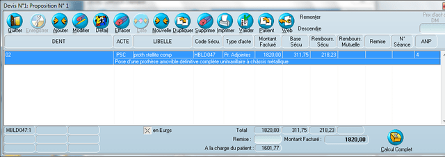 Je viens de comprendre enfin que pour faire dans julie un devis d'un complet maxillaire on met 01 et quand c'est mandibulaire c'est 02. Par contre comment faites vous pour faire le devis d'un complet résine provisoire (ou 13 dents il me semble). Pourriez vous me montrer avec une capture d'écran svp.