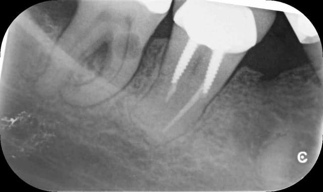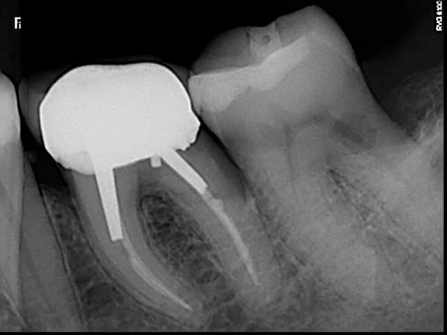as tu vérifié la face vestibulaire de la racine distale? Probable carie radiculaire.